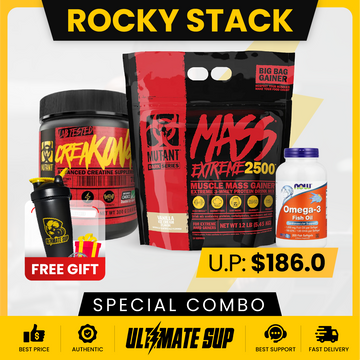 The Combo ROCKY STACK offers everything a hard gainer needs to build muscle and gain mass. This health supplement package includes Mutant Mass Extreme 2500 (12lbs), CreaKong (249g), and Omega 3 (200 softgel).