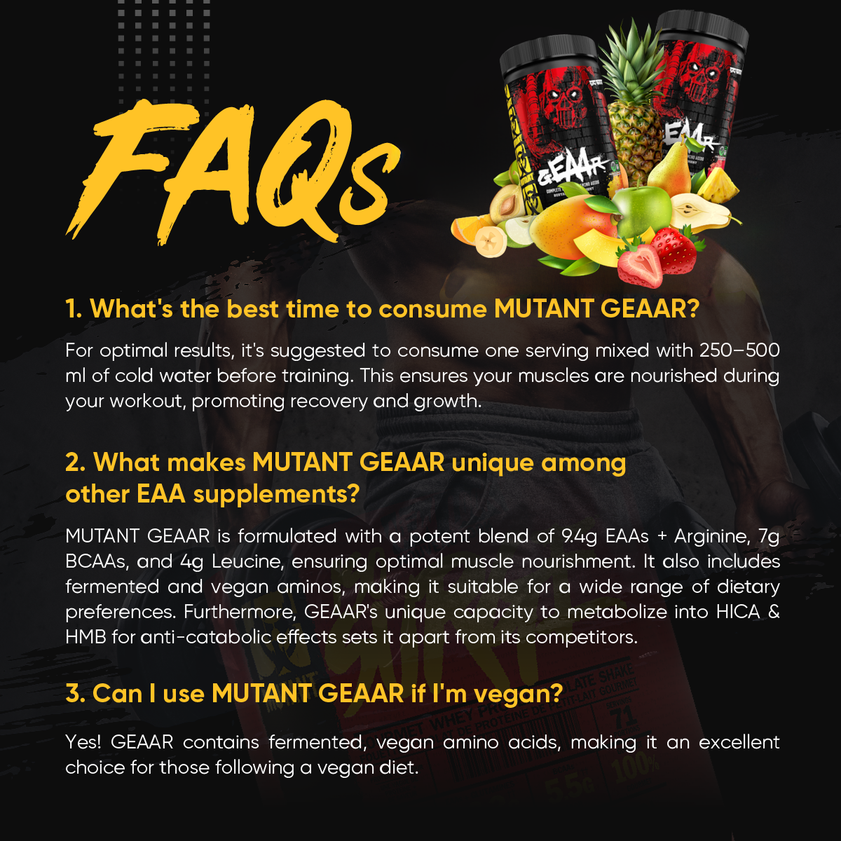 5. How does Mutant GEAAR help in post-workout recovery? The high-quality formulation of EAAs and BCAAs in Mutant GEAAR aids in reducing muscle soreness and speeds up the recovery process after exercise.