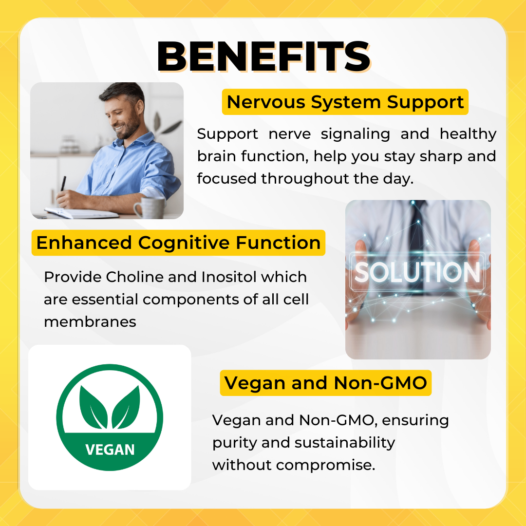 Enhanced Cognitive Function: Choline is a key component in acetylcholine synthesis, crucial for memory and learning, while Inositol supports neurotransmitter signaling, promoting mental clarity and focus.