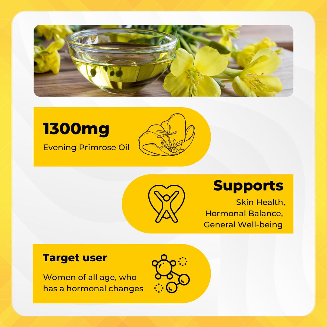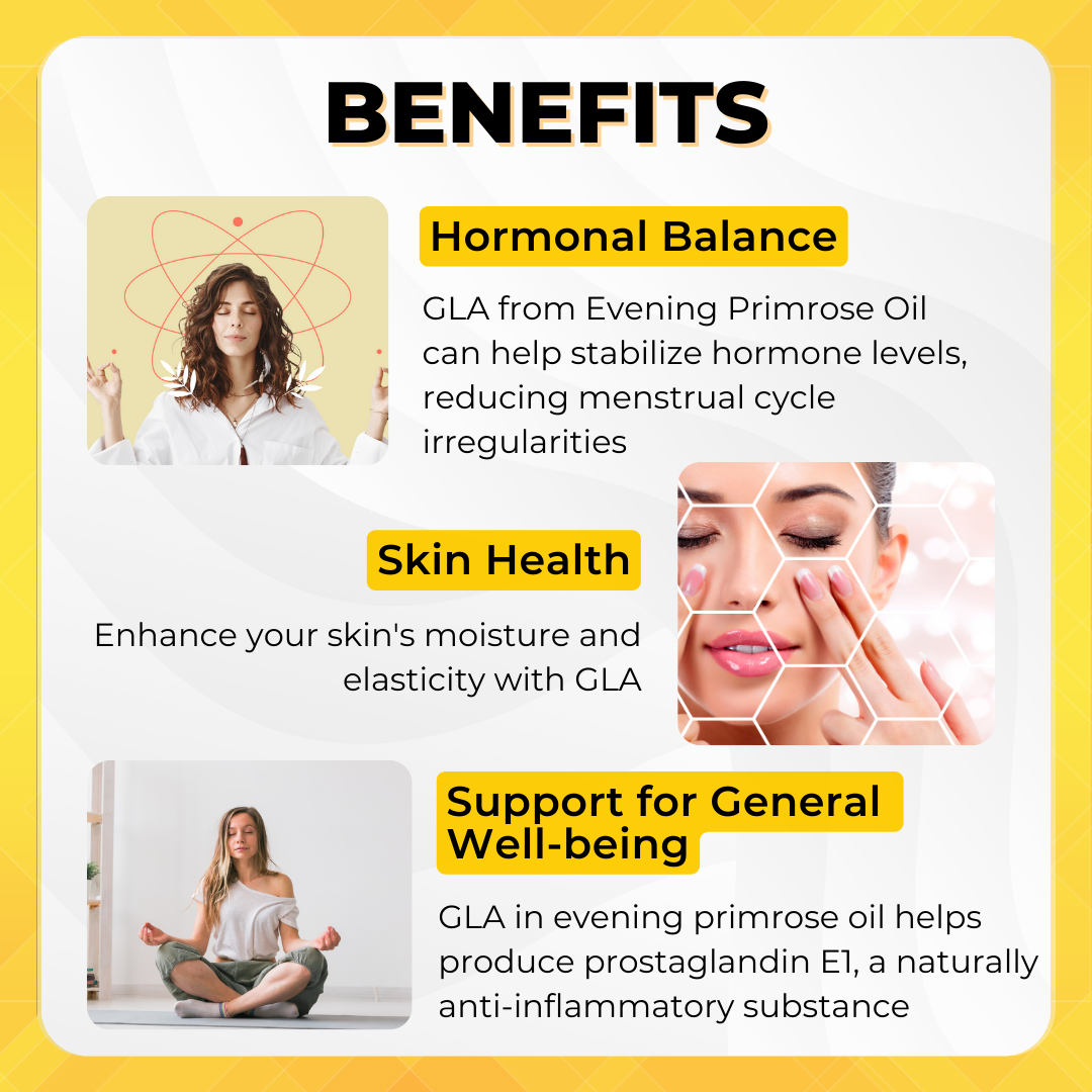 - Hormonal Harmony: GLA from Evening Primrose Oil can help stabilize hormone levels, reducing menstrual cycle irregularities and promoting emotional well-being.