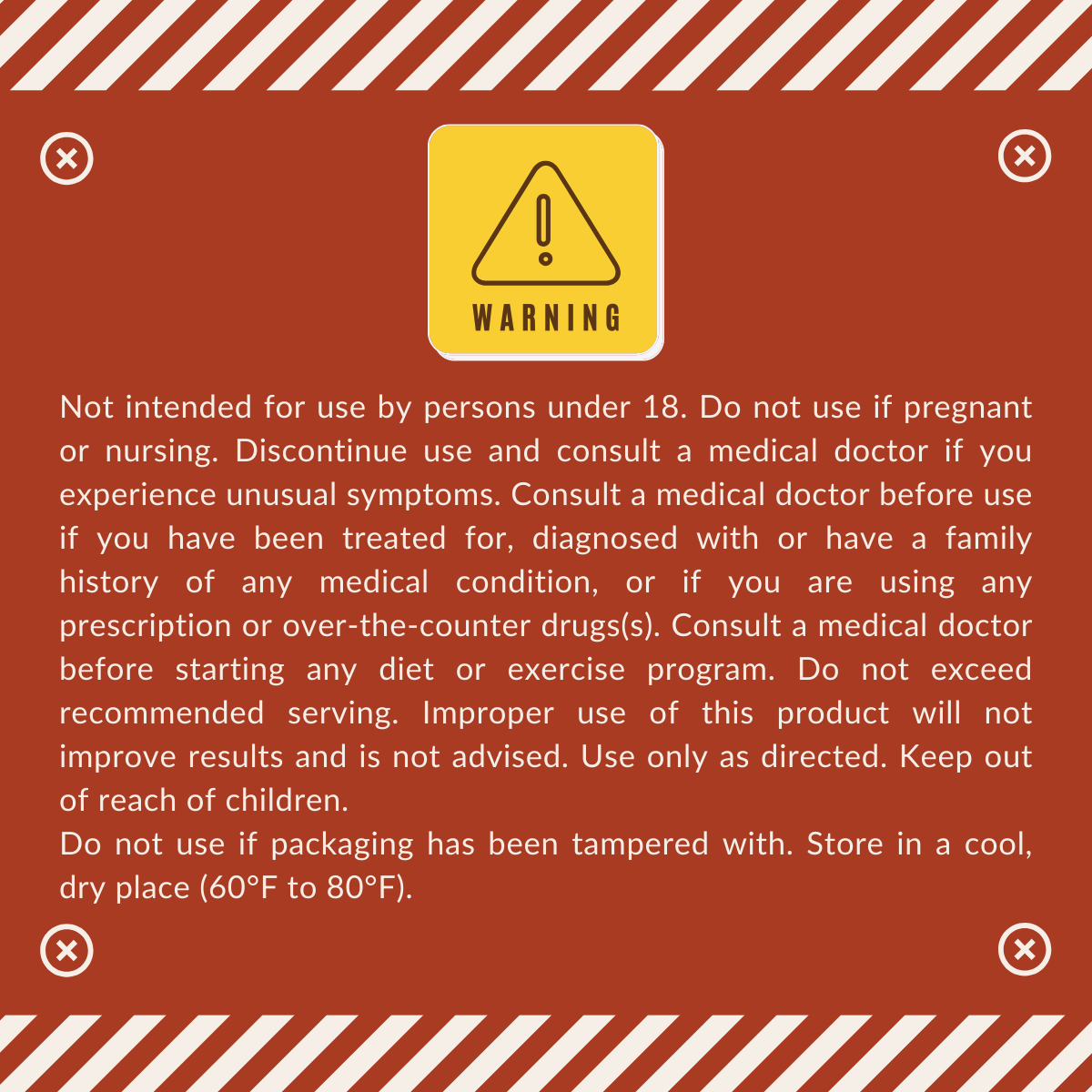 For adult use only. Do not use it if pregnant or nursing. Consult a doctor before use if you have a medical condition before starting a diet or exercise program. Keep out of reach of children.