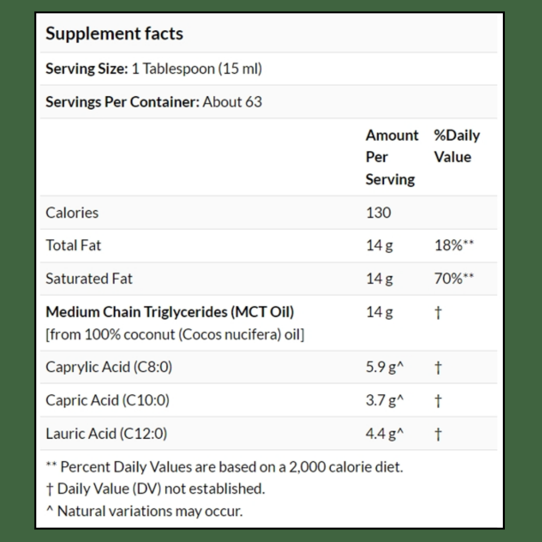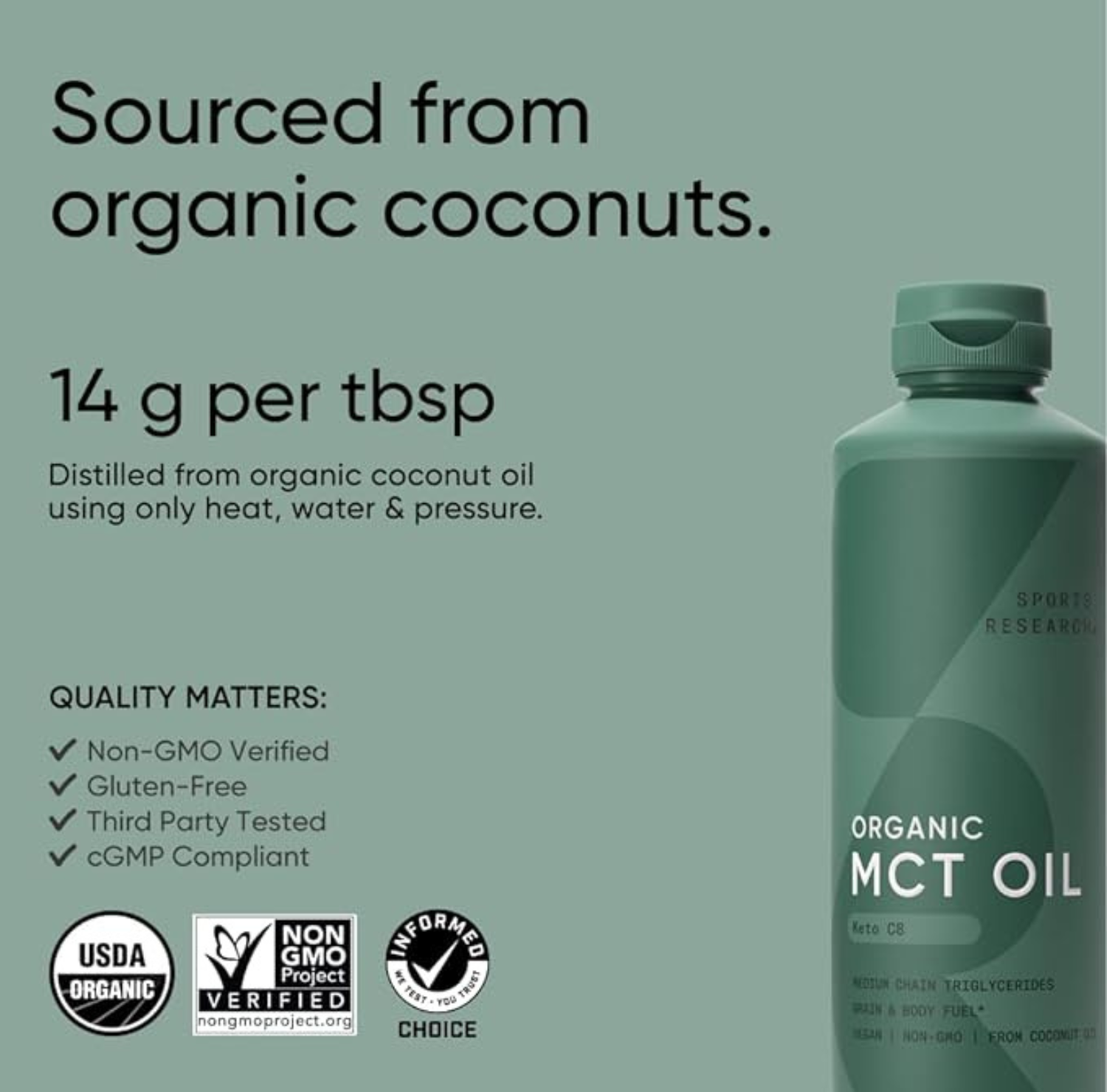 Sports Research MCT Oil is a Non-GMO Verified alternative to traditional oils, as well as sports and energy drinks. Packed with nutritious fats, Medium Chain Triglycerides (MCTs) are quickly digested, absorbed and converted into fuel for the body and brain. SR MCT Oil is made exclusively from Coconut Oil (zero palm) and contains the full-spectrum of MCTs; including lauric acid, a healthy fatty acid also found in mother's milk.