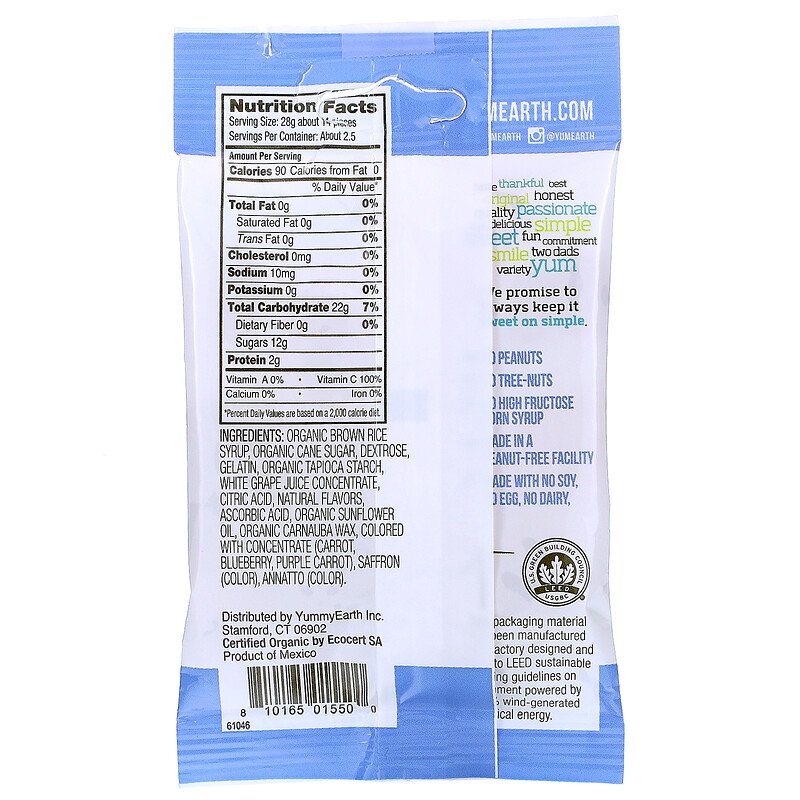 Organic brown rice syrup, organic cane sugar, dextrose, gelatin, organic tapioca starch, white grape juice concentrate, citric acid, natural flavors, ascorbic acid, organic sunflower oil, organic carnauba wax, colored with concentrate (carrot, blueberry, purple carrot), saffron (color), annatto (color).